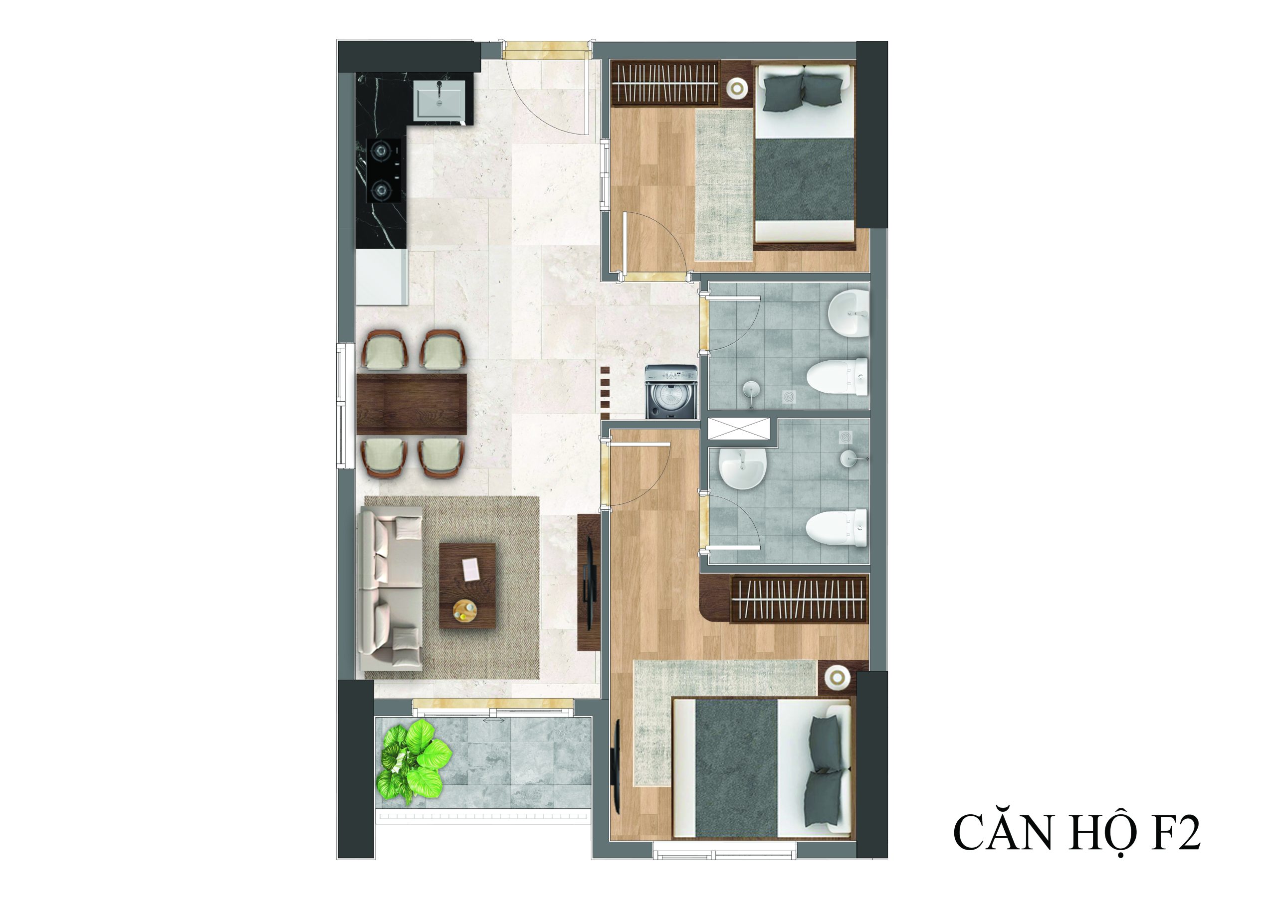 Căn hộ 2 phòng ngủ: 51m2 – 54m2 – 56m2 – 58m2 – 60m2 – 65m2