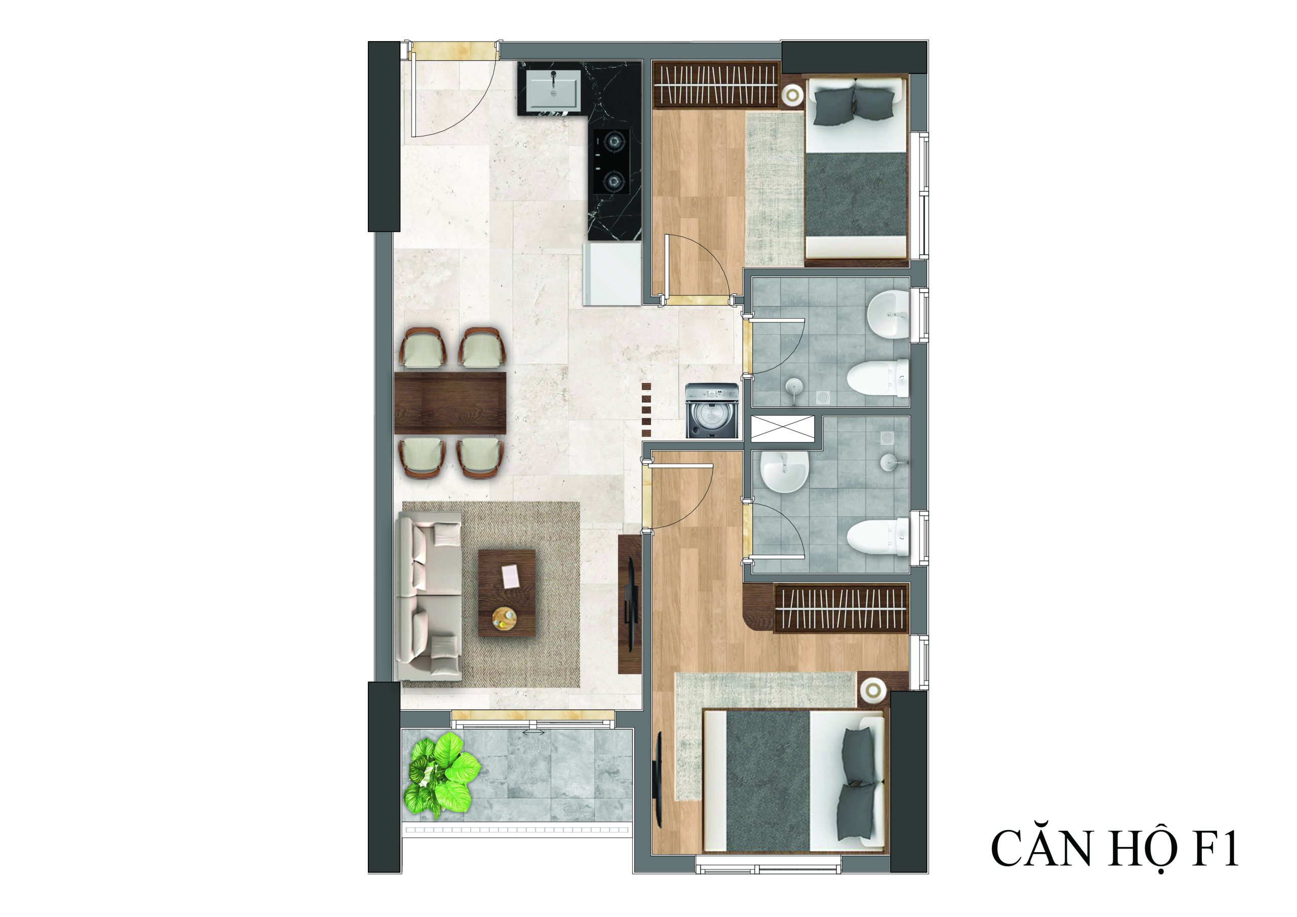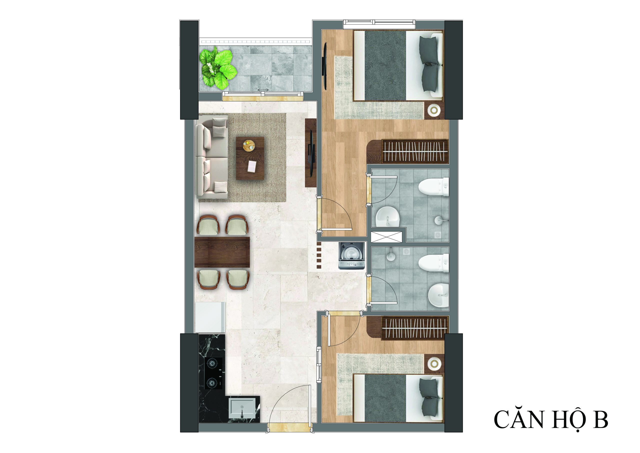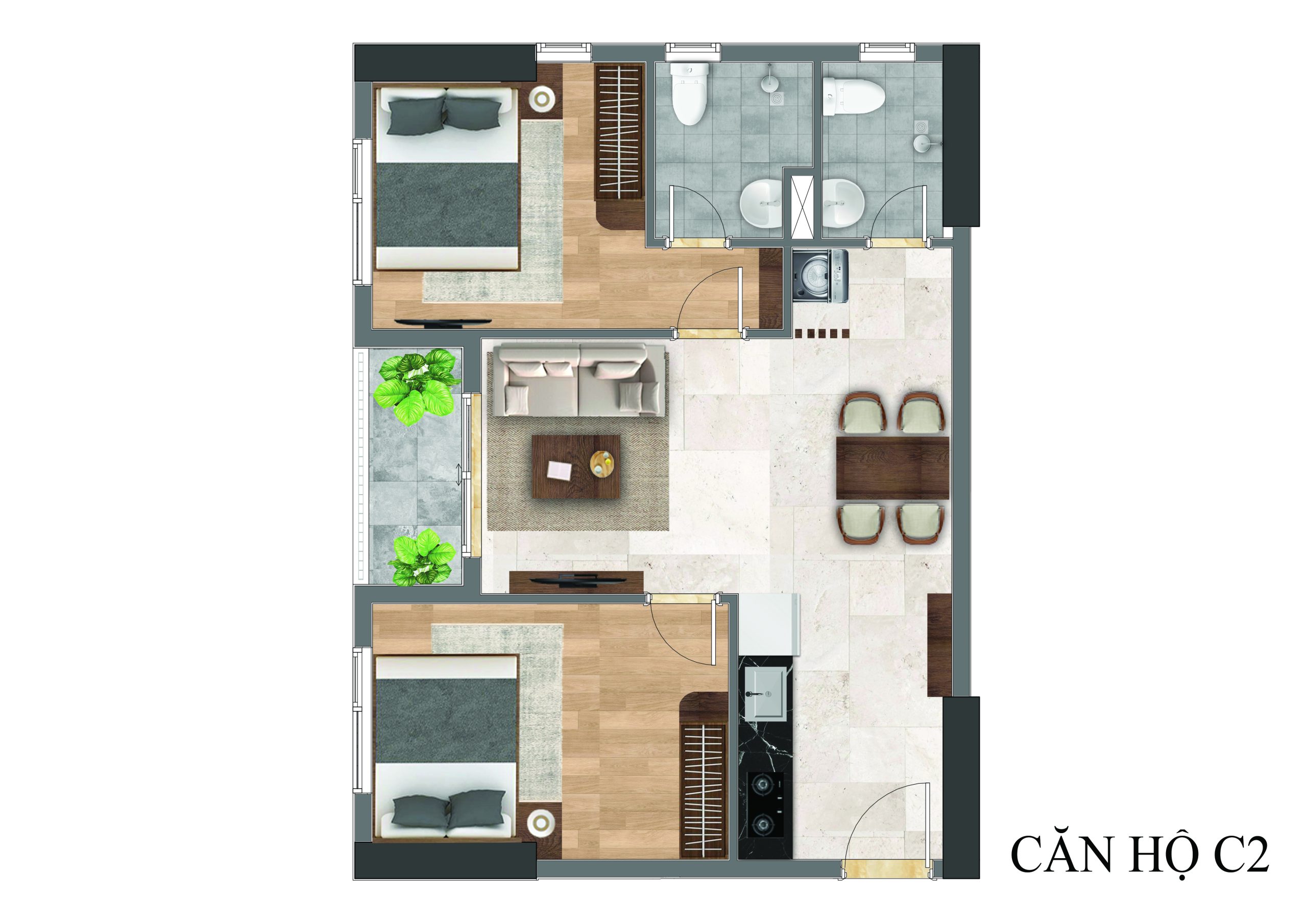 Căn hộ 2 phòng ngủ: 51m2 – 54m2 – 56m2 – 58m2 – 60m2 – 65m2