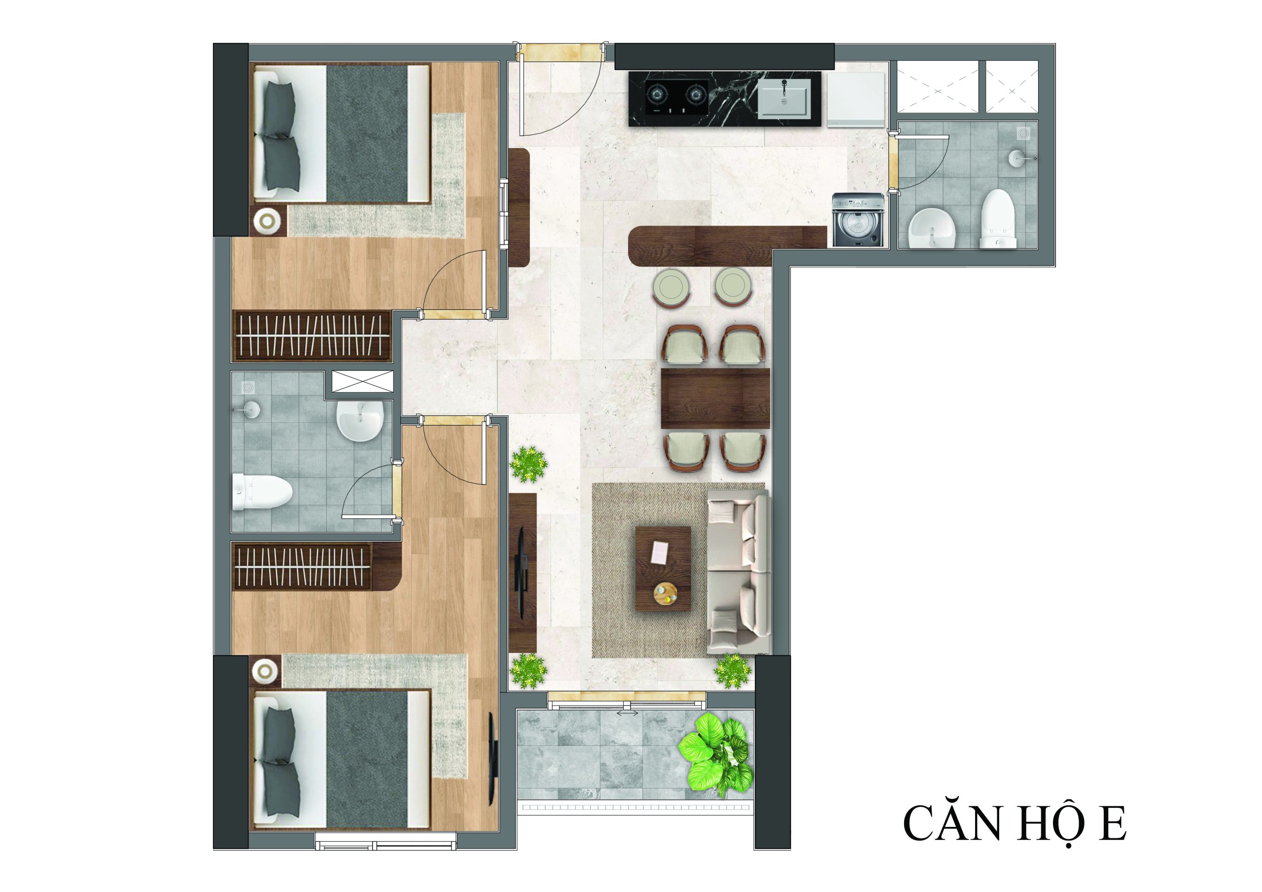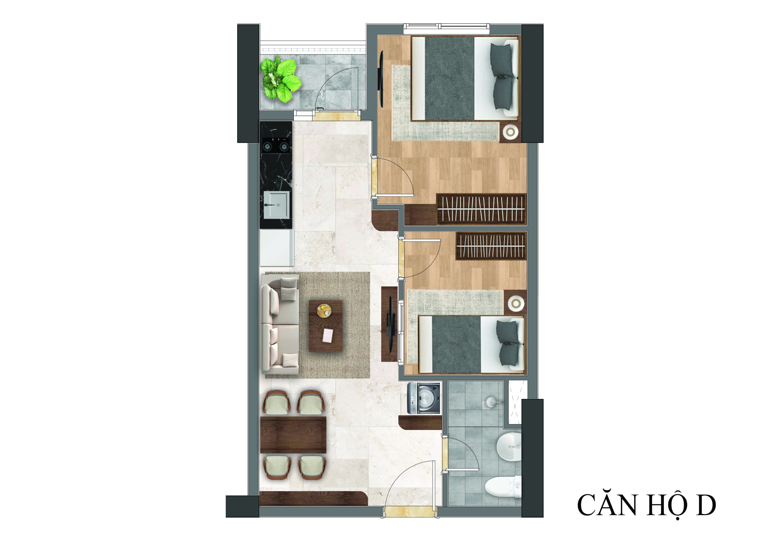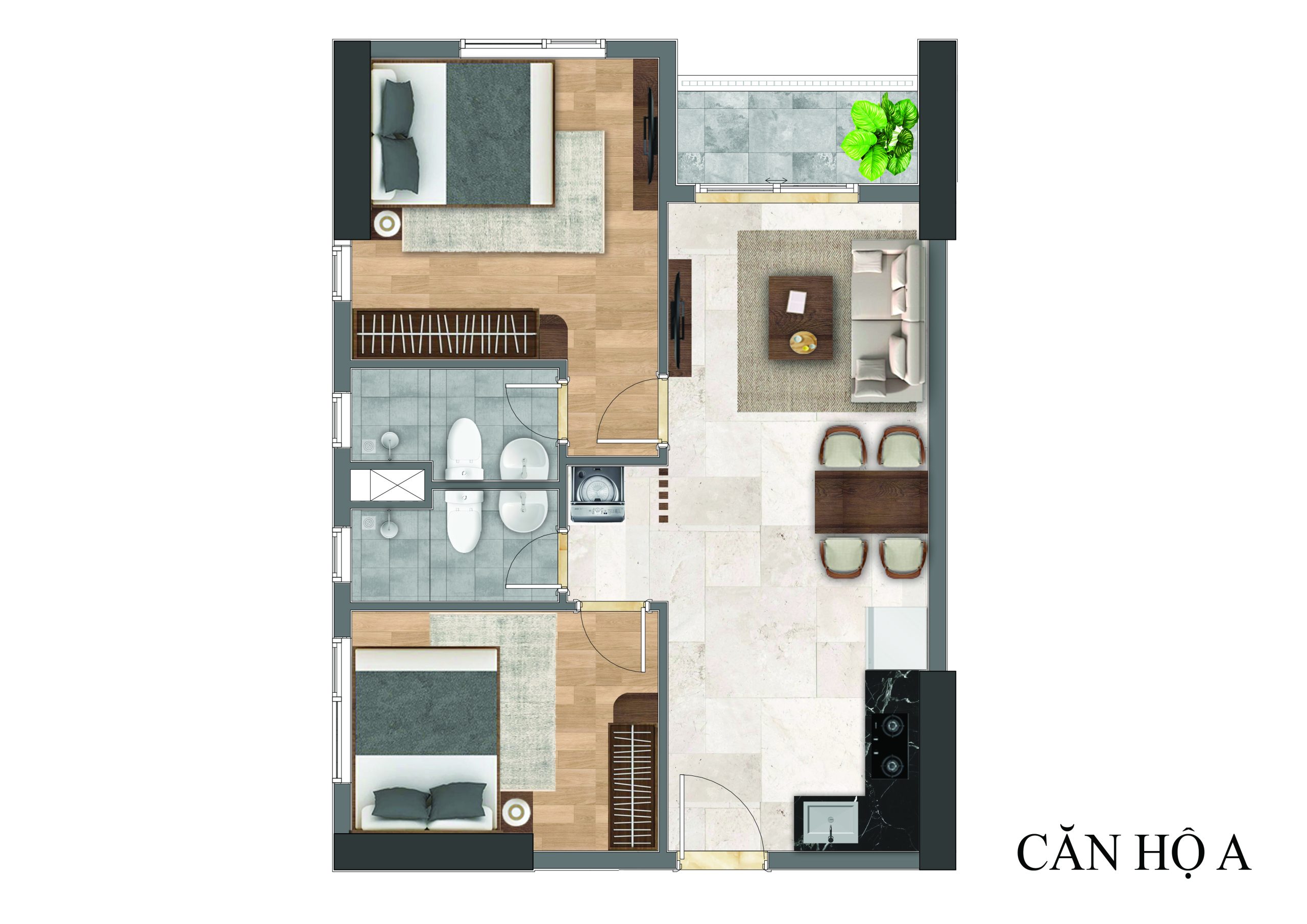 Căn hộ 2 phòng ngủ: 51m2 – 54m2 – 56m2 – 58m2 – 60m2 – 65m2