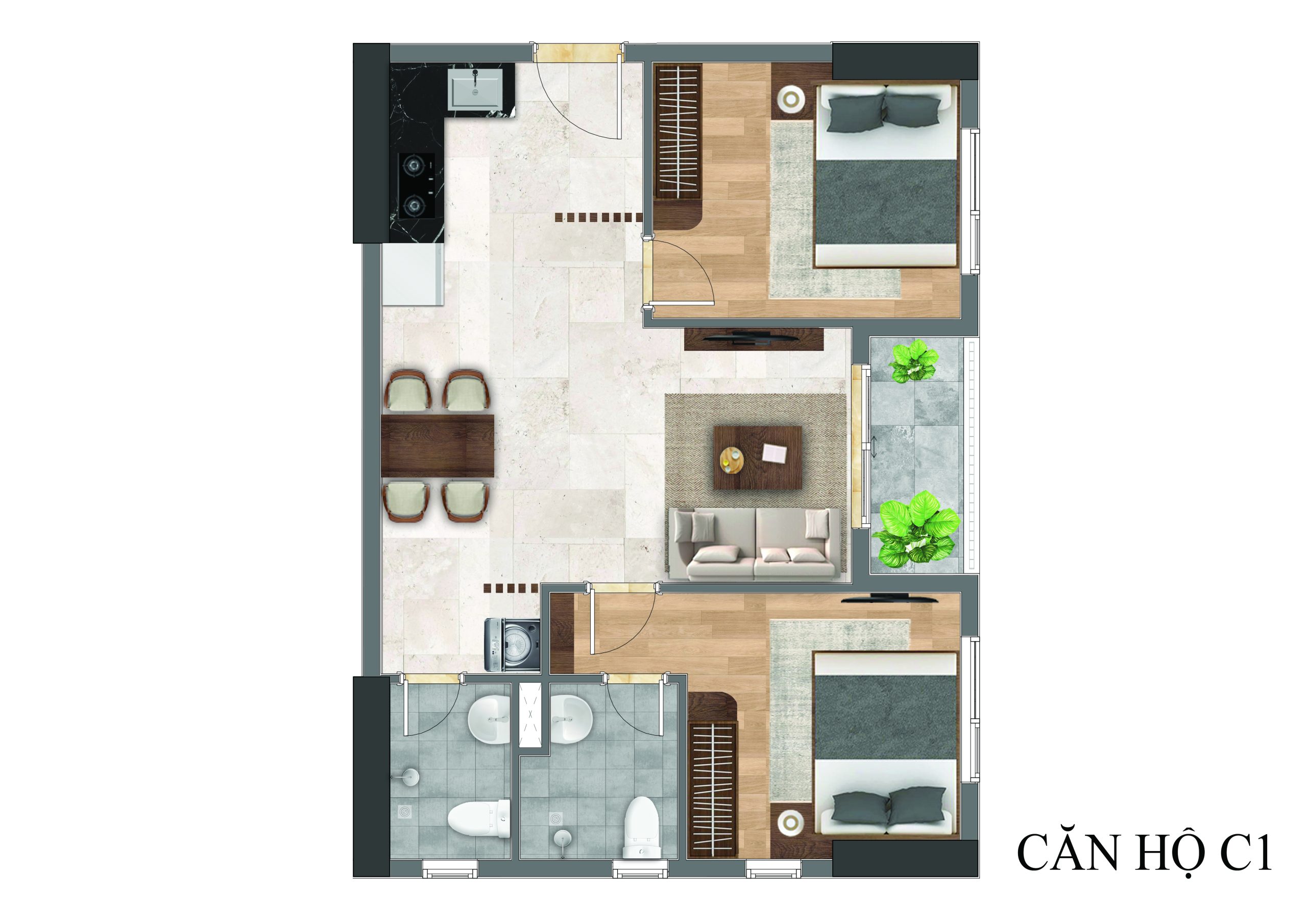 Căn hộ 1 phòng ngủ: 43m2 – 47m2