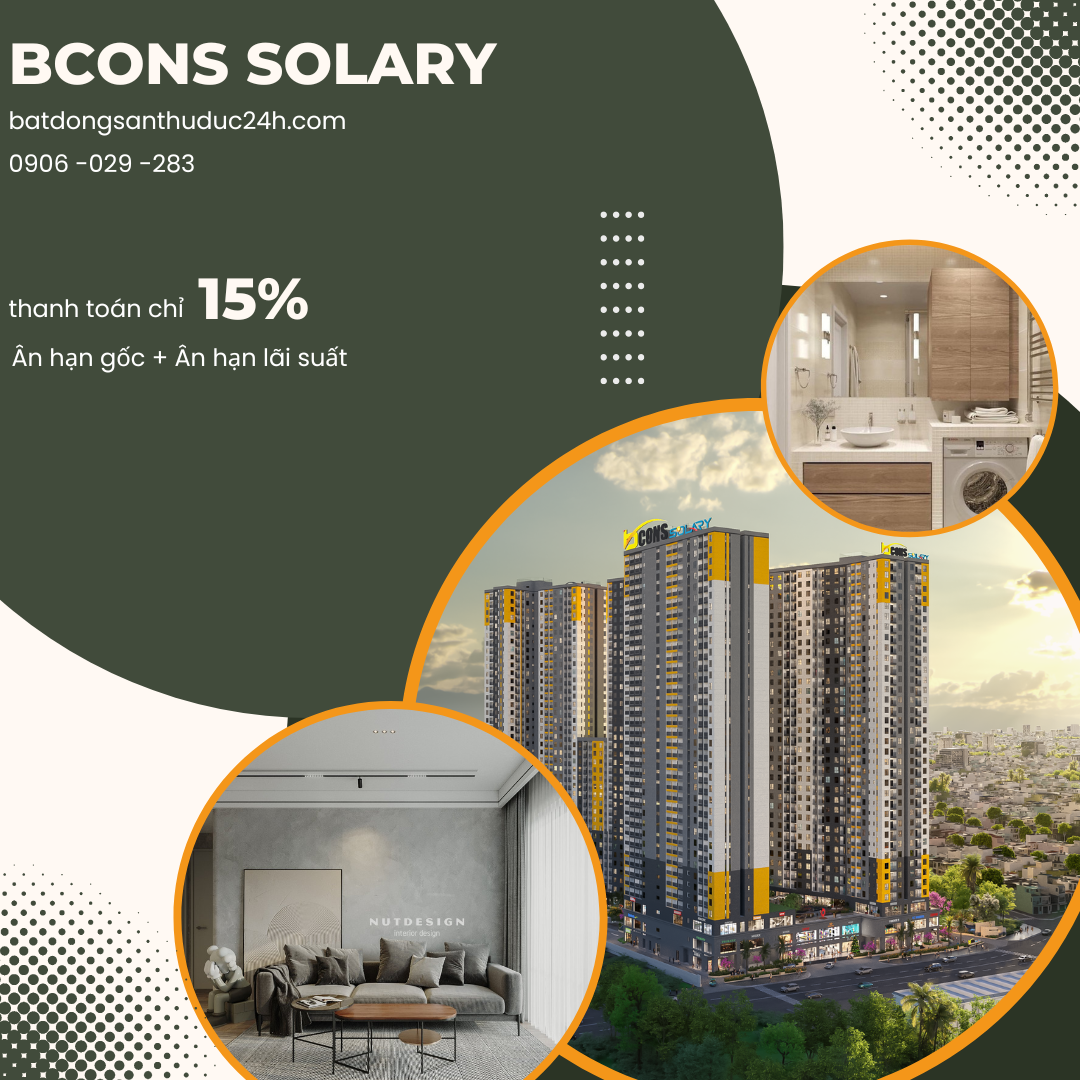Bcons Solary là dự án khu căn hộ chung cư do tập đoàn chủ đầu tư Bcons phát triển tọa lạc tại đường số 4, Khu công nghiệp Tân Đông Hiệp B, thành phố Dĩ An, tỉnh Bình Dương. Dự án có quy mô 1,8 hecta gồm 4 tòa tháp cao từ 36 đến 38 tầng cung ứng ra thị trường Bình Dương hơn 1800 căn hộ, với thiết kế tỉ mỉ chi tiết từ 1 đến 3 phòng ngủ, phục vụ nhu cầu đa dạng của dân cư.