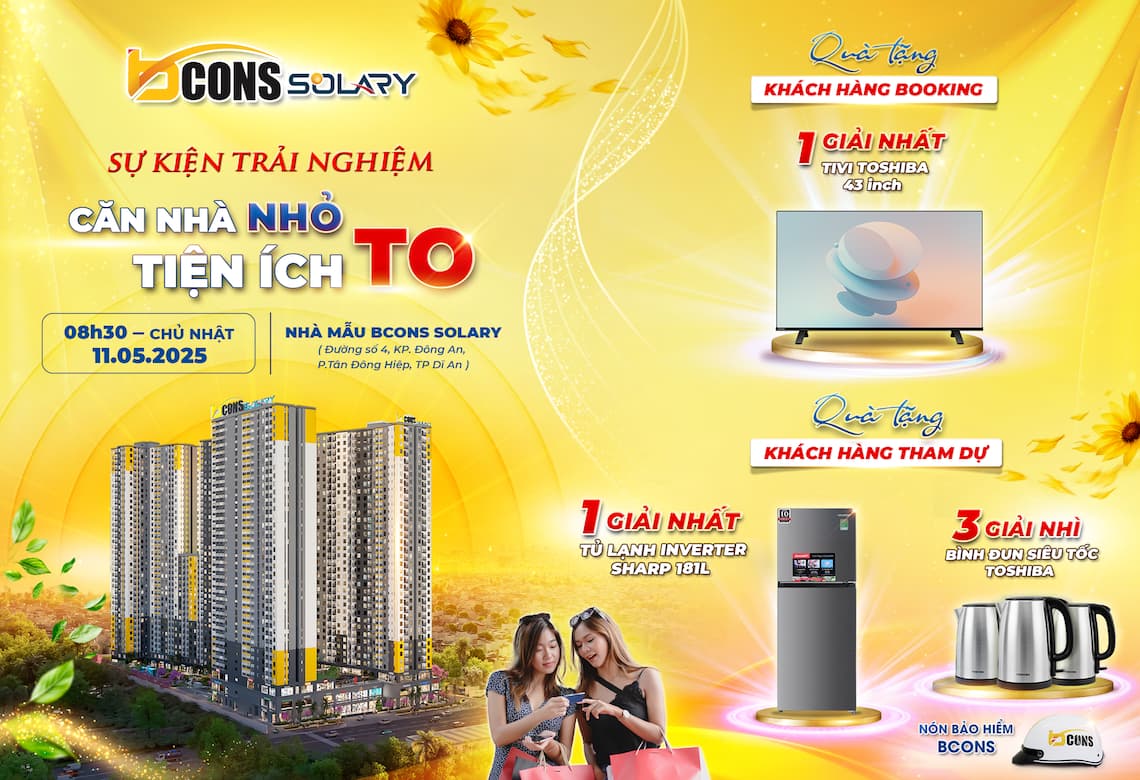 “Thông báo Quy định tham dự và bốc thăm tại Sự kiện giới thiệu Tháp C – Dự án BCONS SOLARY ngày 29/06/2025”,__________________________________________________🕗 Thời gian: 8h00 – Chủ Nhật, Ngày 29/06/2025📍 Địa điểm: Nhà mẫu dự án Bcons Solary – Đường số 4, KP. Đông An, P. Tân Đông Hiệp, TP. Dĩ An, Tỉnh Bình DươngĐến với sự kiện, khách hàng sẽ có cơ hội nhận thật nhiều phần quá hấp dẫn và giá trị đến từ BTC:🎉🎉🎉 Quà tặng dành cho Khách hàng giao dịch thành công💥 💥 Bốc thăm may mắn 💥👉 01 XE MÁY HONDA AIR BLADE👉 01 MÁY GIẶT SẤY TOSHIBA INVERTER👉 03 TỦ LẠNH SAMSUNG INVERTER🎉🎉🎉 Quà tặng đặc biệt dành cho Khách hàng tham dự đến cuối sự kiện👉 Bốc thăm may mắn Giải Nhất : 01 TIVI SAMSUNG 55 INCH👉 Bốc thăm may mắn Giải Nhì : 02 MÁY LỌC KHÔNG KHÍ XIAOMI👉 Bốc thăm may mắn Giải Ba : 03 BÌNH ĐUN SIÊU TỐC TOSHIBA